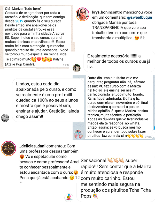 Sou Mariza Santos, fundadora da Sweet Buquê, sou especialista em trabalhar com caramelos e Pirulitos de Cristal, hoje tenho mais de 3000 alunos espalhados em todo território nacional e até fora do país, meu curso precisou ser legendado em inglês para atender inúmeros pedidos internacionais.